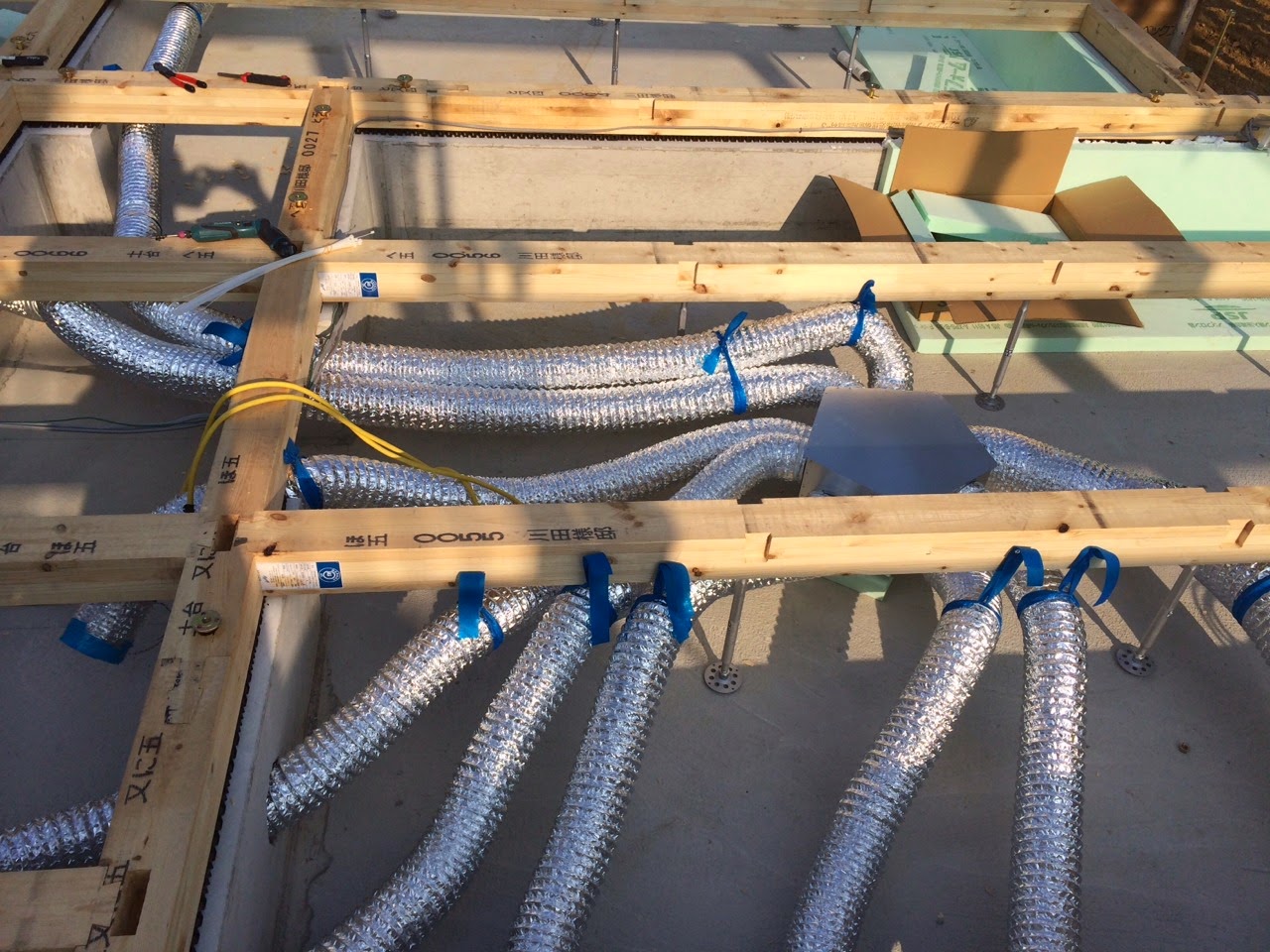 まずは基礎断熱材施工とEco-i24時間換気システムの施工です。