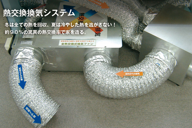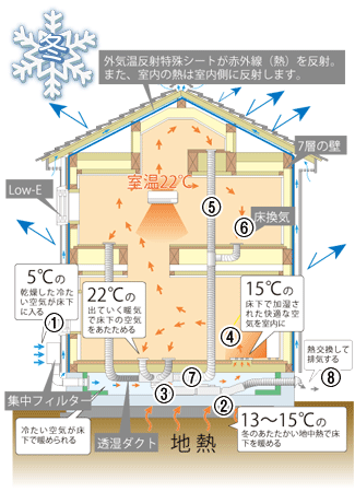 ③全熱交換機から床下へ空気を送り、地熱により床下の空気を暖めます。