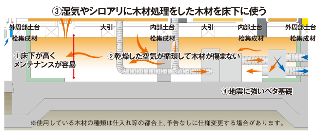 エコ・アイ工法は、床下にも乾燥した空気を循環させて、木材の耐久性を高めるだけでなく、床下を高くしてメンテナンスを容易にしています。