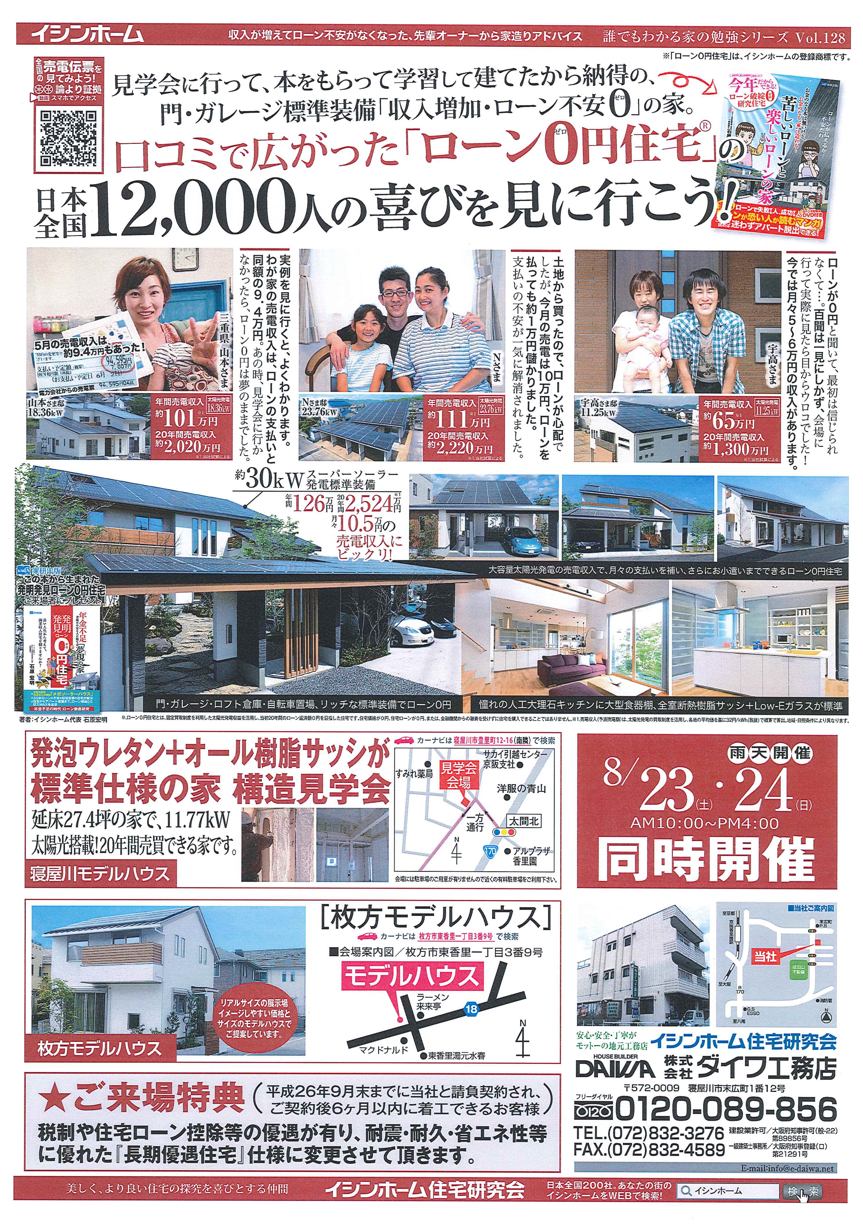 8月23日(土)・24日(日) AM10:00~PM4:00 枚方・寝屋川モデルハウス 2会場同時に見学会を開催します。