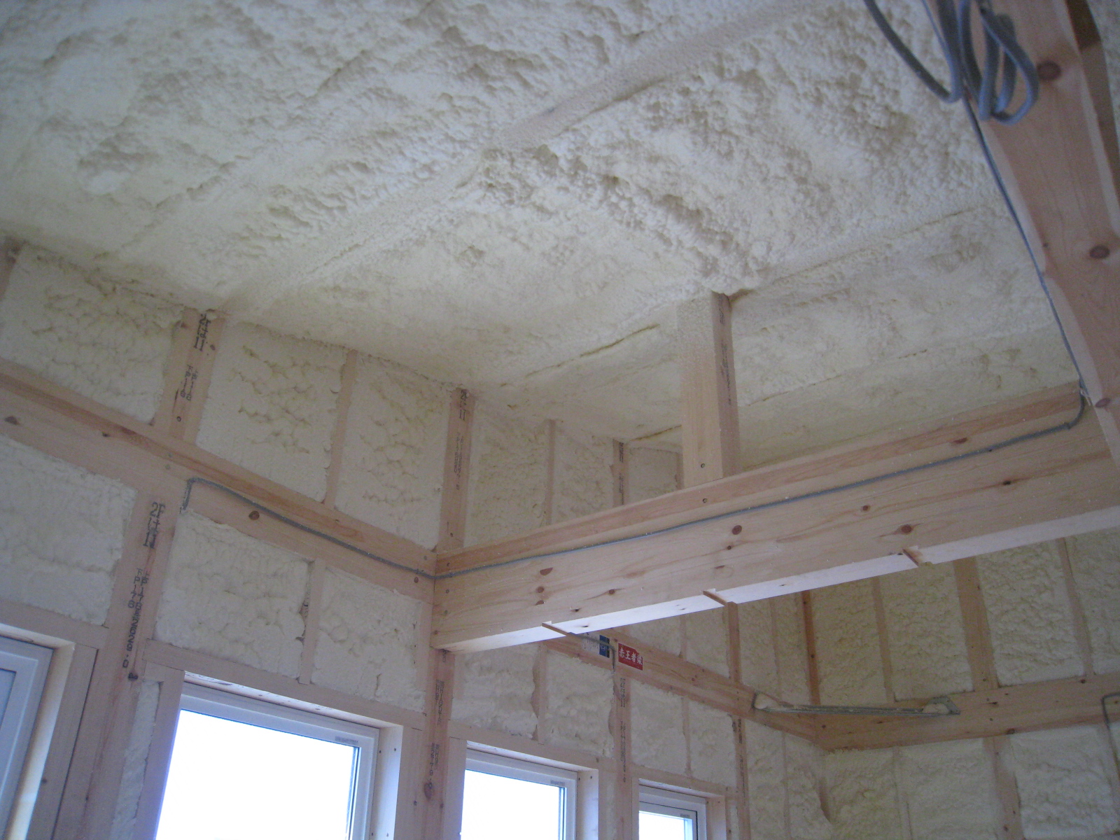 壁も天井にも、このような感じで、ウレタン断熱の吹付が行われます。