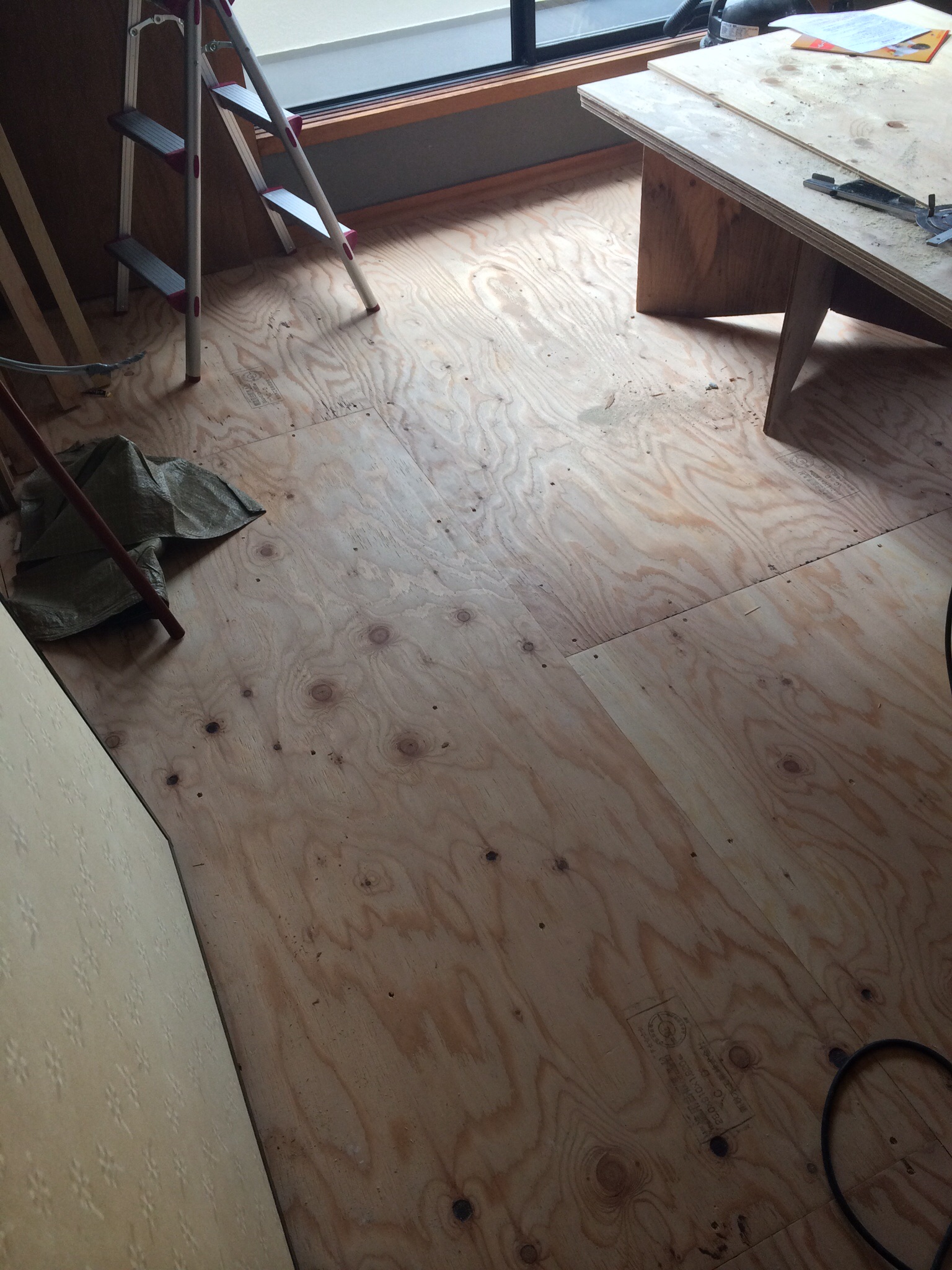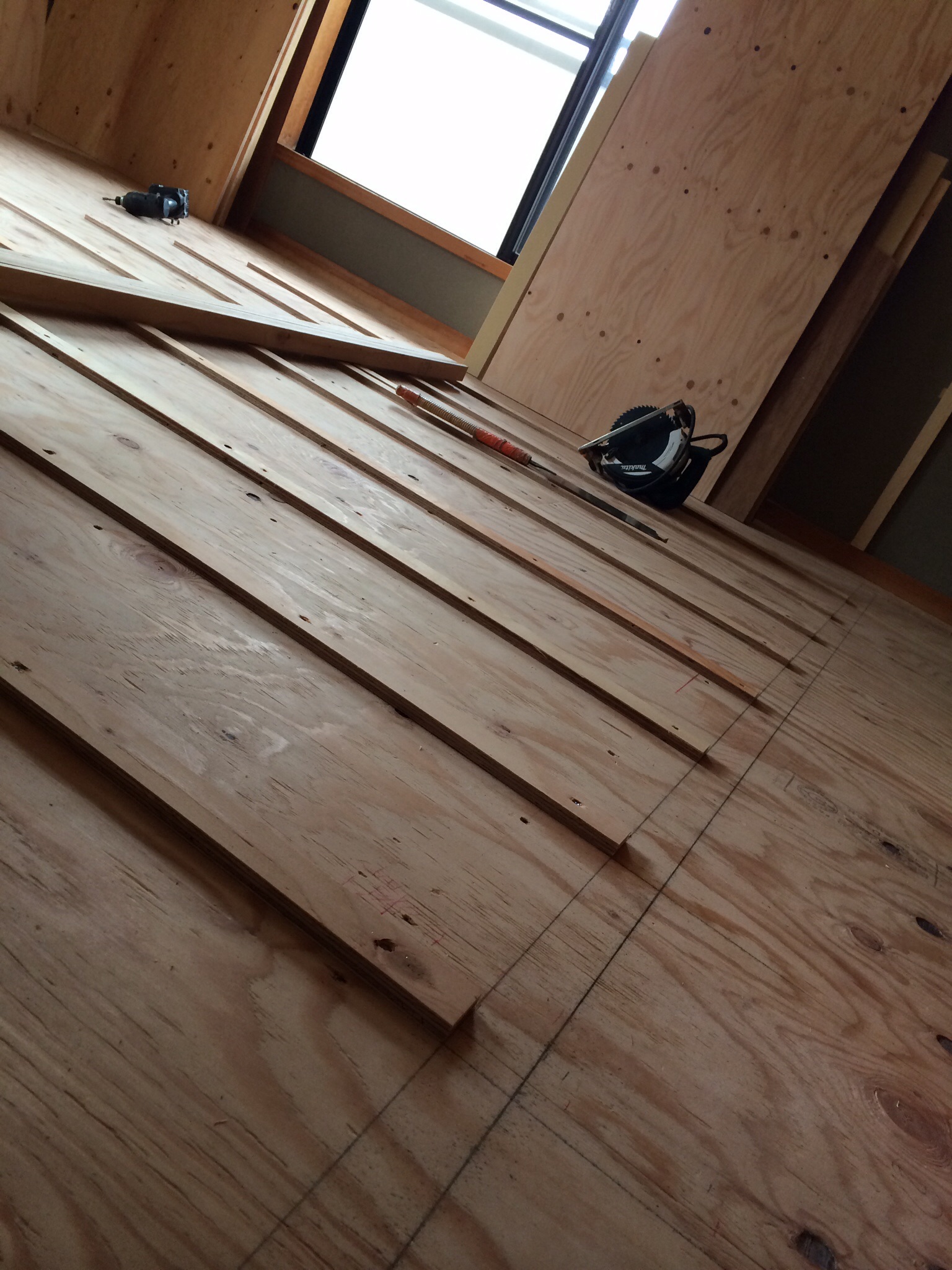 床の補強も兼ねて、24mmの構造用合板で増し貼りをおこなっています。