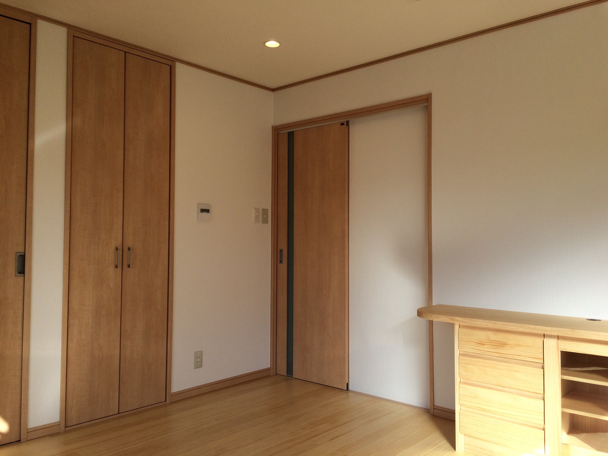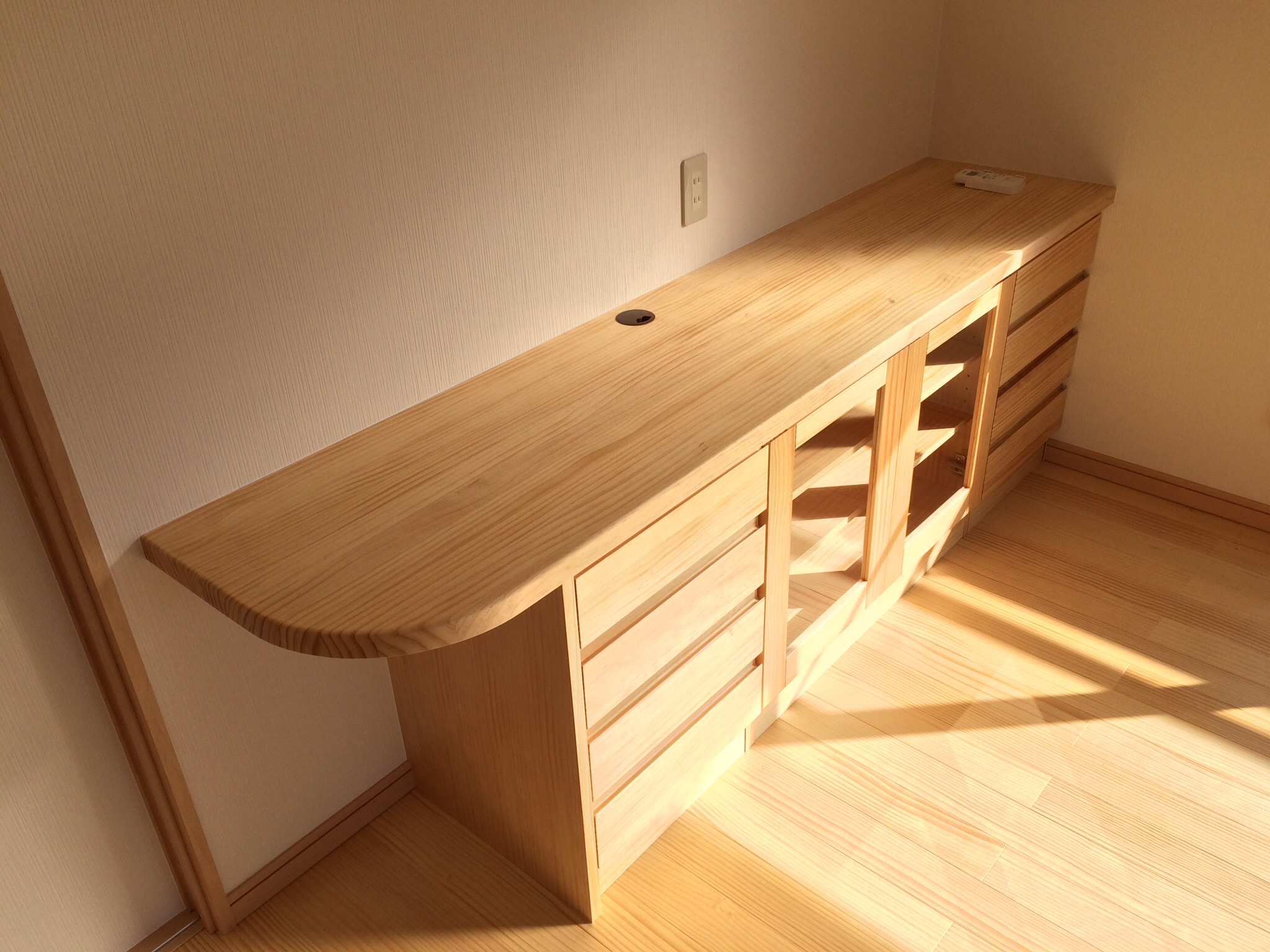 無垢材の床暖房対応フロアとお揃いの造り付け家具も設置しました。