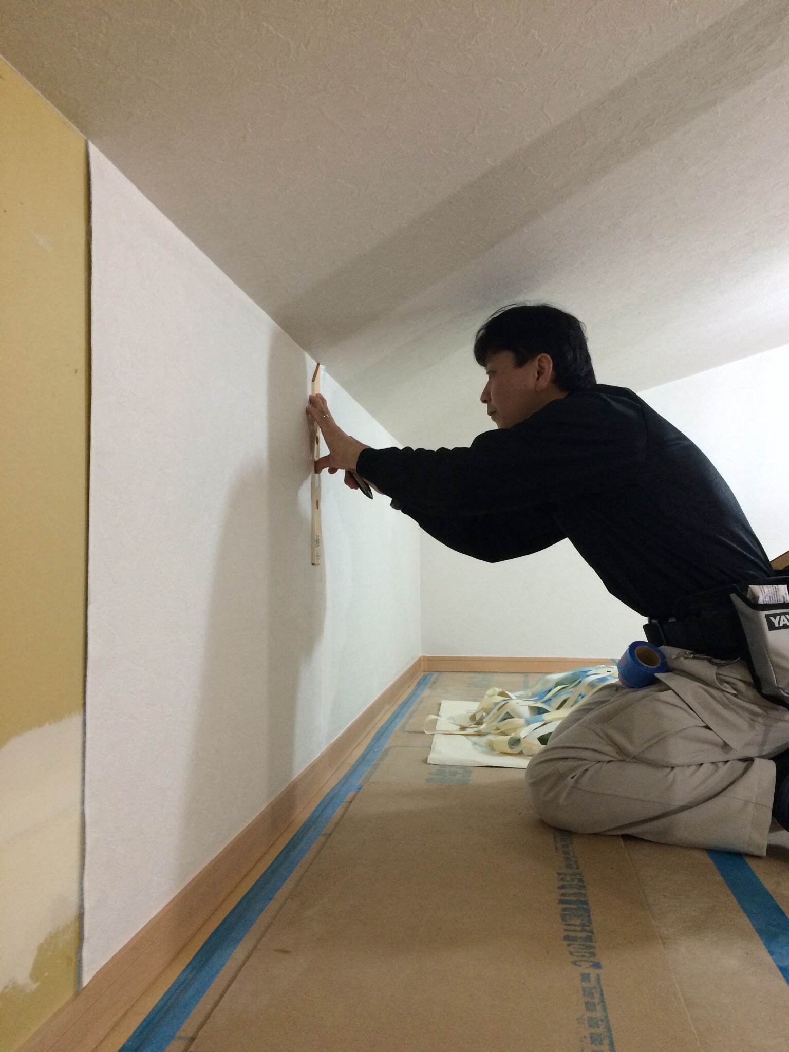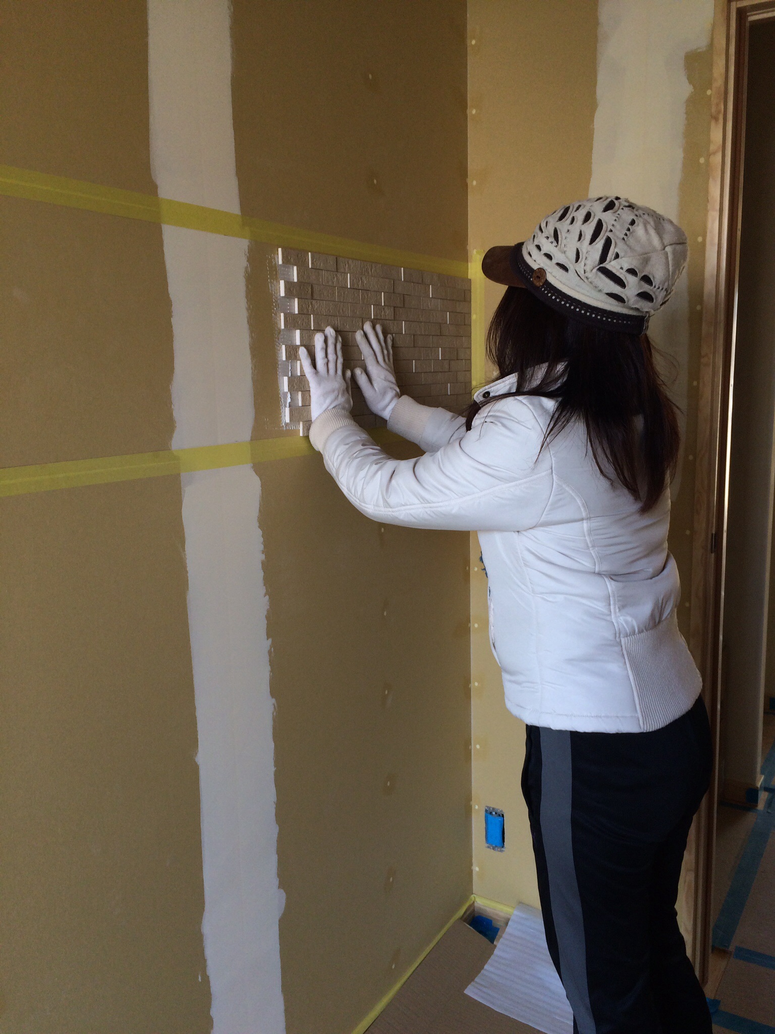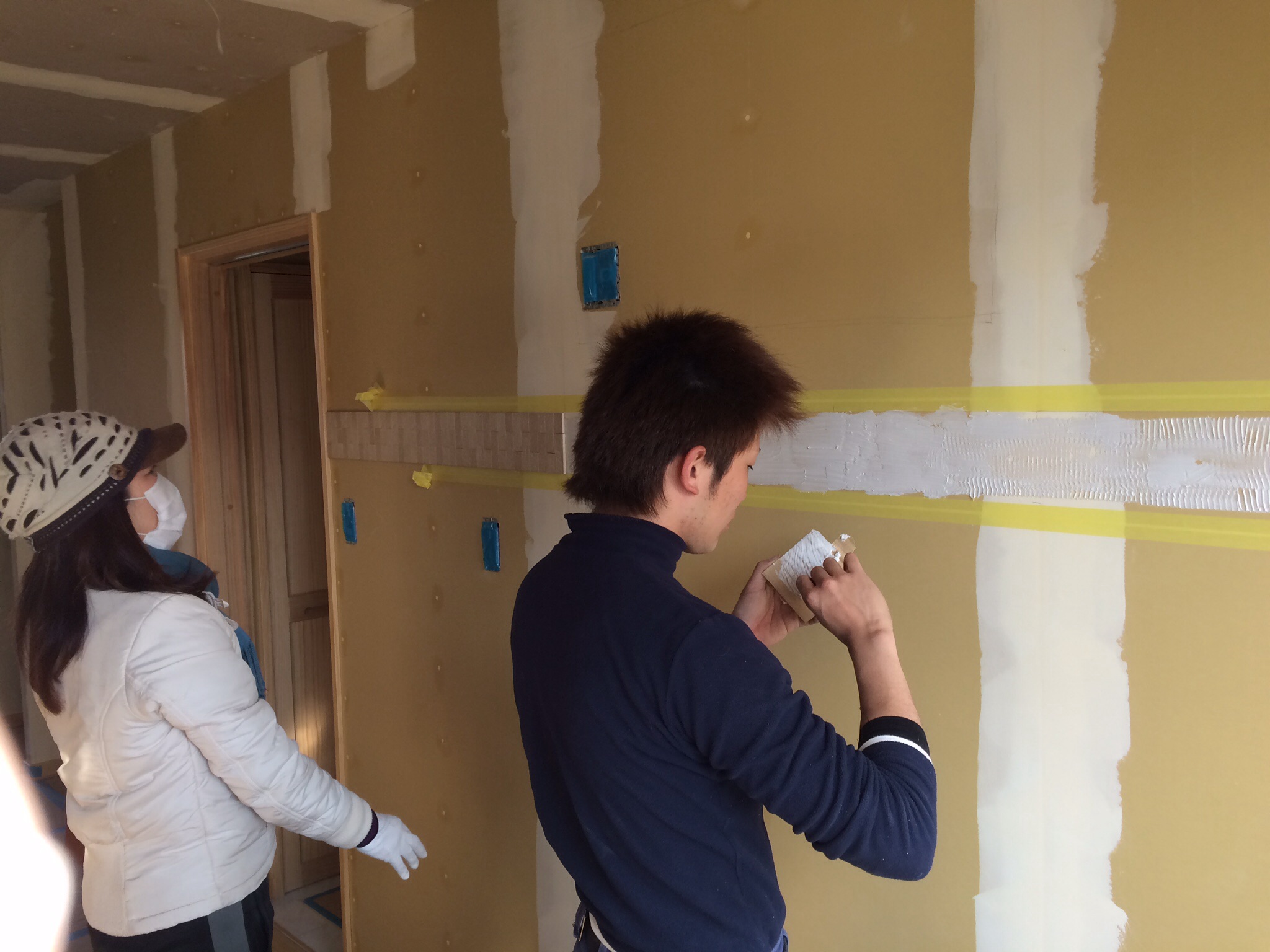 社内の木工事検査も無事合格し、現在、内装工事の真っ最中です。 内装クロス工事の最中で、職人さんも真剣な表情ですね。 施主様にも、プチ作業!! 内装タイルのエコカラットを施工してもらっています。 次男さんも、お手伝いをしてくれました。