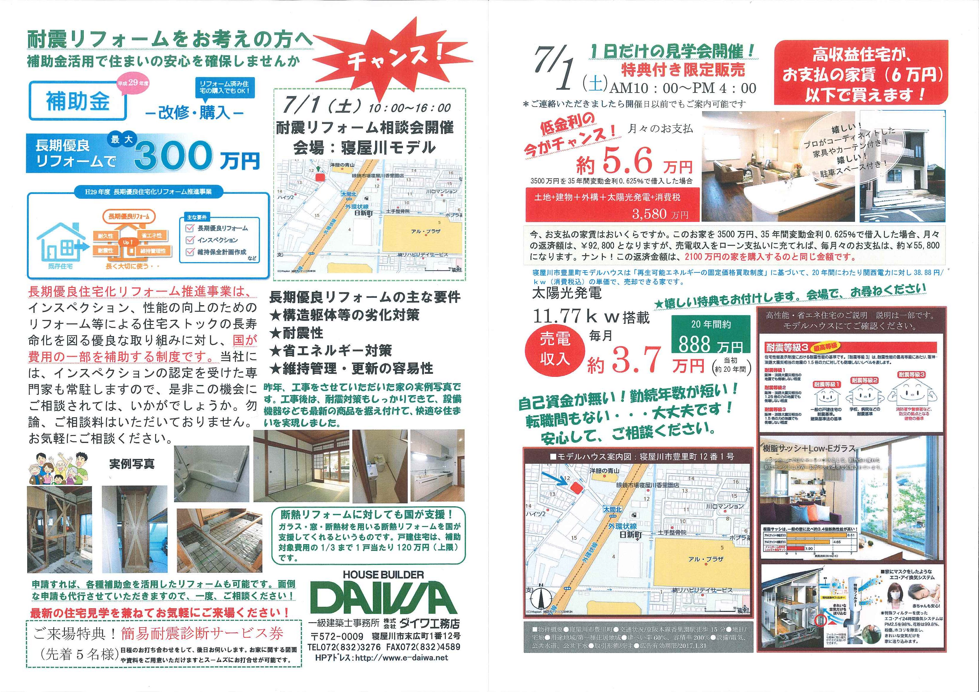 寝屋川モデルハウスの分譲見学会と耐震リフォーム相談会を