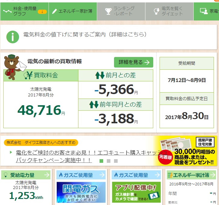 寝屋川モデルに搭載されている太陽光発電における7月12日から8月9日までの売電実績は48,716円となりました。先月よりは少ないものの、ありがたい売電収入です。