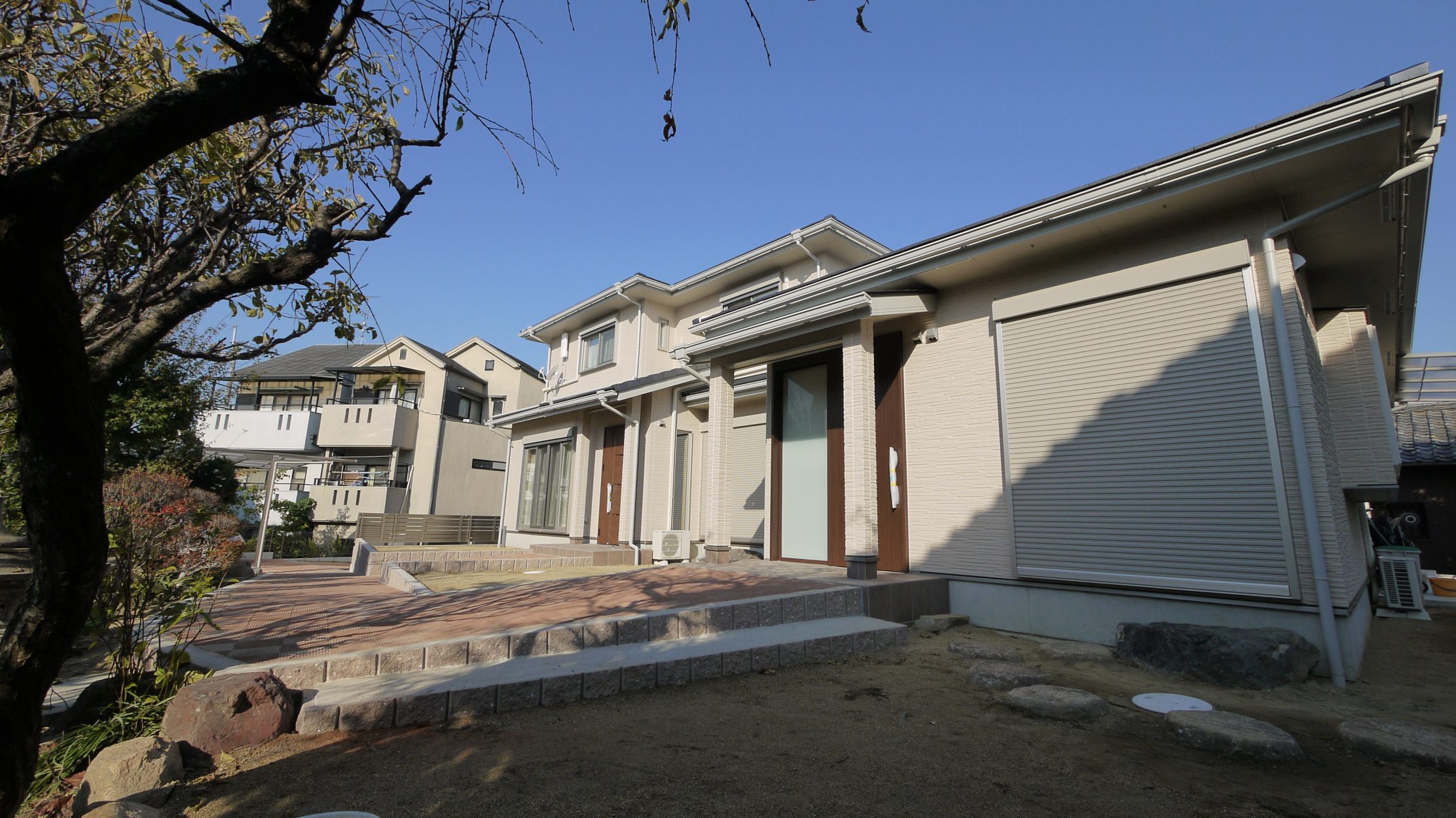 外観 2世帯 玄関別で親世帯は高齢になったときのため敷地入り口からスロープにて出入りするようにしました。