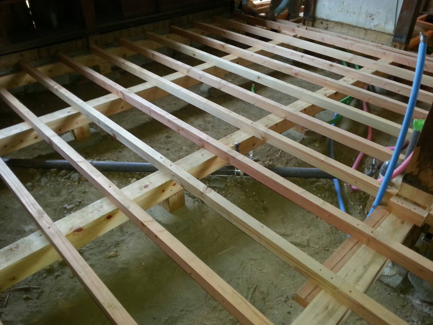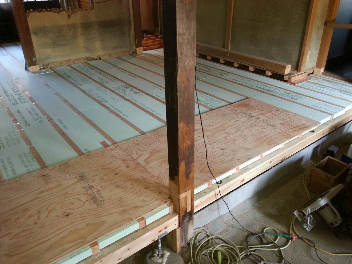 床はすべて撤去しました。蟻害が昔あったようで、悪い土台は取り除き補強し、防蟻処理、土台、大引は桧に入替えしました。