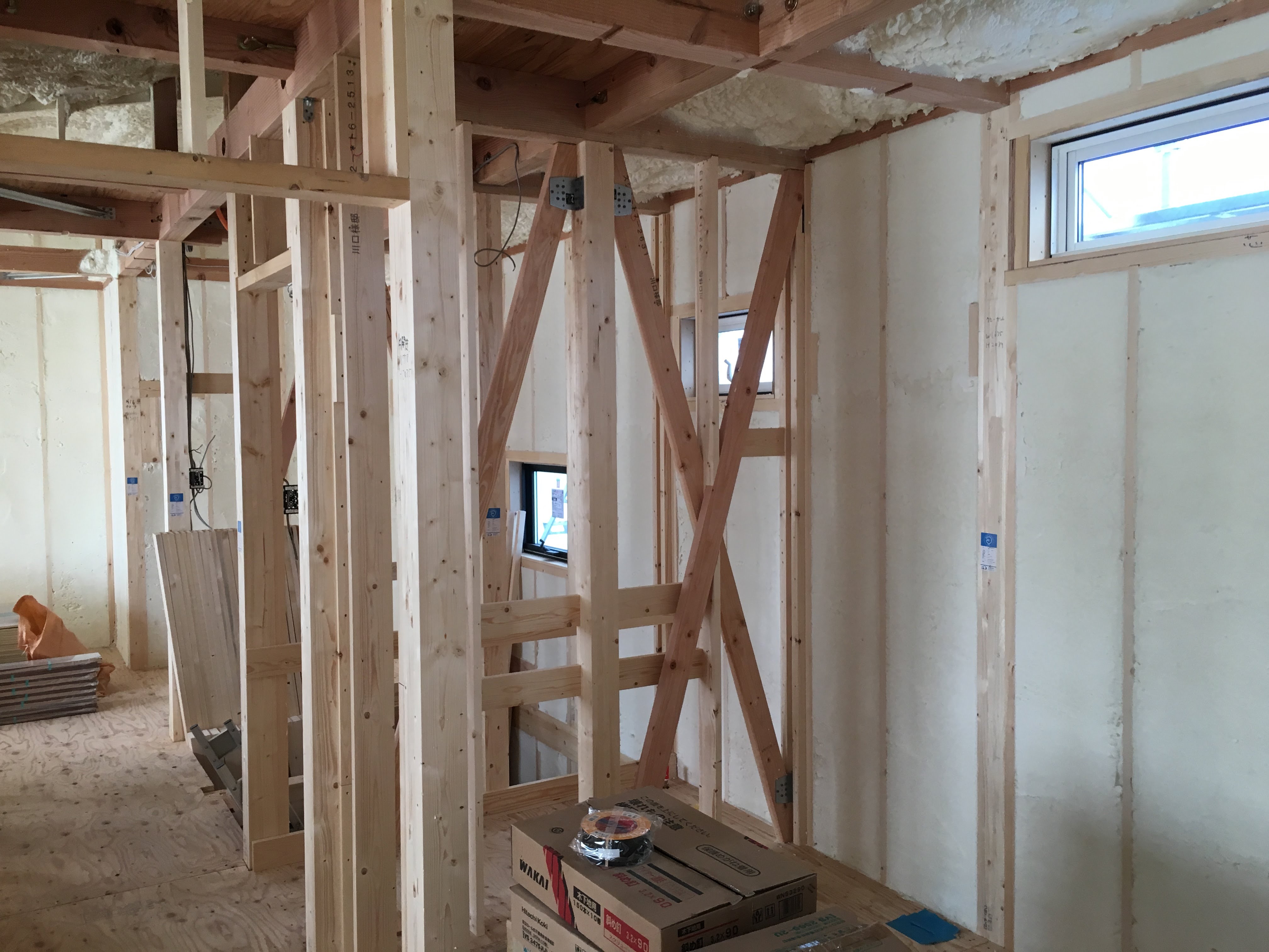 断熱材はグラスウールでも高性能の断熱材もありますが、ウレタンの吹き付けですと、気密もしっかり出来ます。