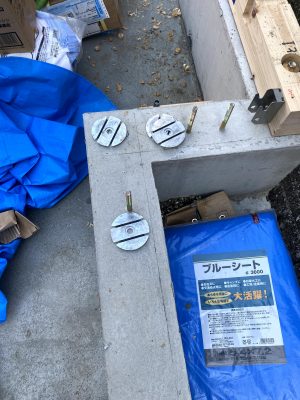 土台施工時の写真、土台と基礎の間に減震金物UFO-Eを施工しています。UFO-Eについて