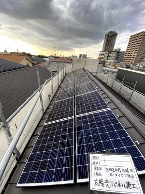 太陽光パネル設置施工の様子 採用したのはQCELLS社の太陽光パネル。 低照度でも効率よく発電し、出力保証なども充実しています。