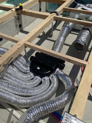基礎断熱材施工、給排水設備、ECO-i24時間熱交換換気システム、床暖冬涼夏の機器設置