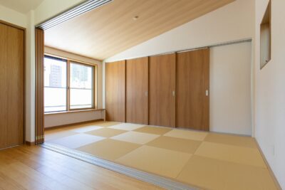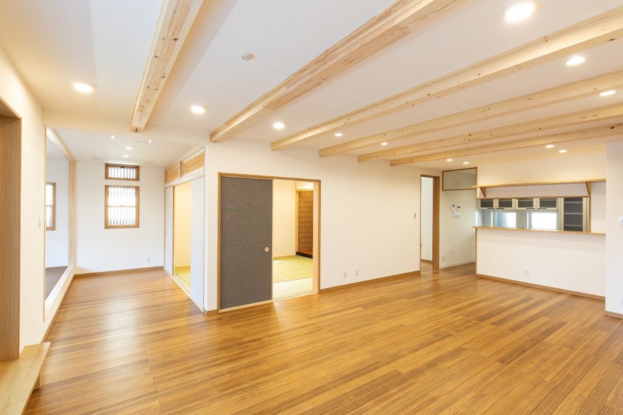 ラーメン構造は筋交いなどの斜め材を入れなくても柱と梁だけで強度が保てるのが特徴。そのため、吹き抜けやビルトインガレージなど、柱がない大空間も実現しやすくなります。