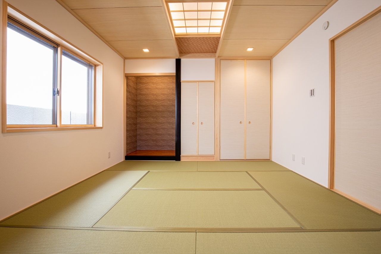 天井には間接照明も使用し、シナベニアと網代天井を使用しました。